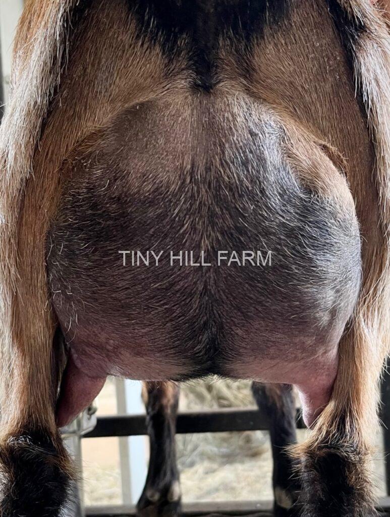Tiny Hill Farm Fun Sized Mars – Teeny (2020 Young Sire Development Qualifier Tiny Hill Farm MoonageDaydream +*B X ELITE SG Tiny Hill Farm Twix 7*M) DOB 3/22/22. Chocolate with white on poll and tail tip. Both of Teeny’s grand-dams are Top Ten does. Here is a link to her pedigree. Teeny’s dam’s highest test day (so far) is 8lbs, and we expect her to follow in her dam’s hoof prints and become a very productive dairy doe. She’s nicely line bred on her grandsire Elite buck SG Sugar Moon V High Roller ++*B. We skipped breeding Teeny this year to streamline our breeding schedule. She will be bred again in the fall of 2026 for 2027 kids.